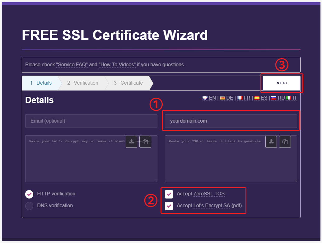 https://zerossl.com/free-ssl/#crt 페이지로 접속해주세요.