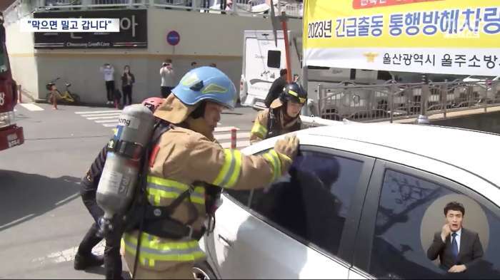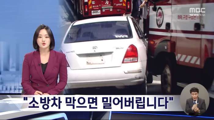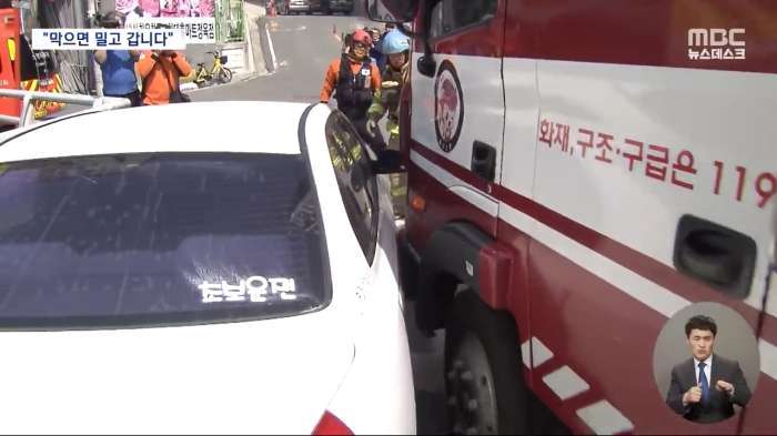 결국 소방차가 주차 차량을 그대로 밀고 지나갑니다.