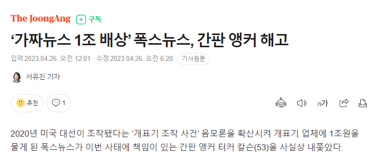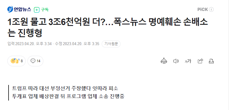 회사의 120년치 매출에 달하는 금액을 폭스뉴스에서 주는것.