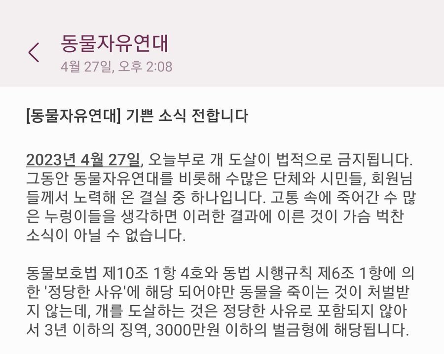 ->개정된법은 사육(합법)/도살(불법)/유통(무법)/식당판매(불법,처벌안함)